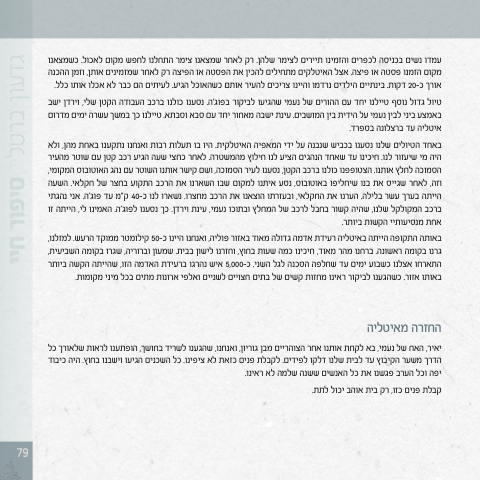 עמדו נשים בכניסה לכפרים והזמינו תיירים לצימר שלהן. רק לאחר שמצאנו צימר התחלנו לחפש מקום לאכול. כשמצאנו מקום הזמנו פסטה או פיצה. אצל האיטלקים מתחילים להכין את הפסטה או הפיצה רק לאחר שמזמינים אותן, וזמן ההכנה אורך כ-20 דקות. בינתיים הילדים נרדמו והיינו צריכים להעיר אותם כשהאוכל הגיע. לעיתים הם כבר לא אכלו אותו כלל. טיול גדול נוסף טיילנו יחד עם ההורים של נעמי שהגיעו לביקור בפוג'ה. נסענו כולנו ברכב העבודה הקטן שלי, וירדן ישב באמצע ביני לבין נעמי על הידית בין המושבים. עינת ישבה מאחור יחד עם סבא וסבתא. טיילנו כך במשך עשרה ימים מדרום איטליה עד ברצלונה בספרד. באחד הטיולים שלנו נסענו בכביש שנבנה על ידי המאפיה האיטלקית. היו בו תעלות רבות ואנחנו נתקענו באחת מהן, ולא היה מי שיעזור לנו. חיכינו עד שאחד הנהגים הציע לנו חילוץ מהמשטרה. לאחר כחצי שעה הגיע רכב קטן עם שוטר מהעיר הסמוכה לחלץ אותנו. הצטופפנו כולנו ברכב הקטן, נסענו לעיר הסמוכה, ושם קישר אותנו השוטר עם נהג האוטובוס המקומי, וזה, לאחר שגייס את בנו שיחליפו באוטובוס, נסע איתנו למקום שבו השארנו את הרכב התקוע בחצר של חקלאי. השעה הייתה בערך עשר בלילה. הערנו את החקלאי, ובעזרתו הוצאנו את הרכב מחצרו. נשארו לנו כ-40 ק"מ עד פוג'ה. אני נהגתי ברכב המקולקל שלנו, שהיה קשור בחבל לרכב של המחלץ ובתוכו נעמי, עינת וירדן. כך נסענו לפוג'ה. האמינו לי, הייתה זו אחת מנסיעותיי הקשות ביותר. באותה התקופה הייתה באיטליה רעידת אדמה גדולה מאוד באזור פוליה, ואנחנו היינו כ-50 קילומטר ממוקד הרעש. למזלנו, גרנו בקומה ראשונה. ברחנו מהר מאוד, חיכינו כמה שעות בחוץ, וחזרנו לישון בבית. שמעון וברוריה, שגרו בקומה השביעית, התארחו אצלנו כשבוע ימים עד שחלפה הסכנה לגל השני. כ-5,000 איש נהרגו ברעידת האדמה הזו, שהייתה הקשה ביותר באותו אזור. כשהגענו לביקור ראינו מחזות קשים של בתים חצויים לשניים ואלפי ארונות מתים בכל מיני מקומות. החזרה מאיטליה יאיר, האח של נעמי, בא לקחת אותנו אחר הצוהריים מבן גוריון, ואנחנו, שהגענו לשריד בחושך, הופתענו לראות שלאורך כל הדרך משער הקיבוץ עד לבית שלנו דלקו לפידים. לקבלת פנים כזאת לא ציפינו. כל השכנים הגיעו וישבנו בחוץ. היה כיבוד יפה וכל הערב פגשנו את כל האנשים ששנה שלמה לא ראינו. קבלת פנים כזו, רק בית אוהב יכול לתת. 79 גדעון ברטל סיפור חיי
